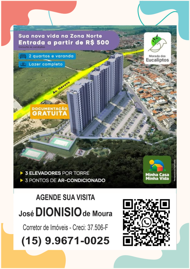 Previous Next Aptos Morada dos Eucaliptos Morada dos EucaliptosTrês Torres Térreo + 19 andares8 aptos por andar 3 elevadores por torre 3 ponto de ar condicionado por apto1 varanda Três Plantas:Tipo 1 ponta 43,08 m2Tipo 2 meio. 43,13 m2Tipo 2 meio. 47,13 m2 garden Uma vaga para cada aptoÁrea de lazer. Brinquedoteca. Churrasqueira . Piscinas adulto e infantil . Playground. Quadra recreativa. Redario . Salão de festas . Salão de jogos. Terraço R$ 215.990,00 Venda Ref. 1